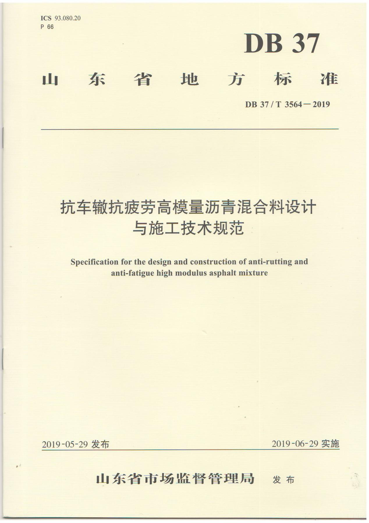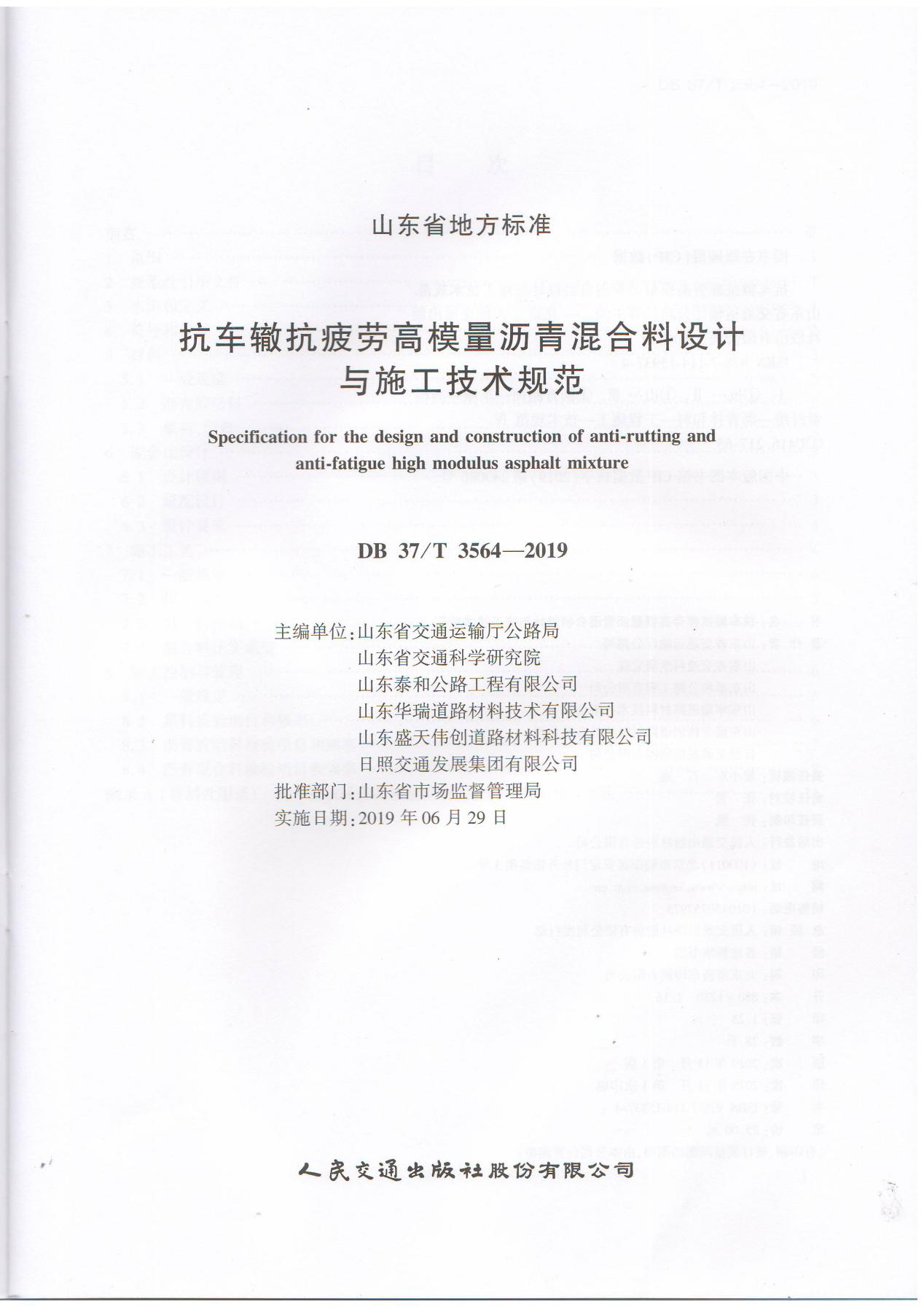 近日,公司參與編制的山東省地方標(biāo)準(zhǔn)《抗車轍抗疲勞高模量瀝青混合料設(shè)計與施工技術(shù)規(guī)范》(DB 37/T 3564-2019)正式出版印刷。