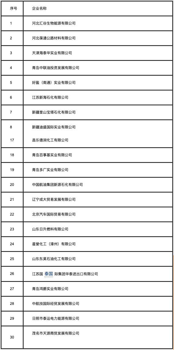 根據(jù)商務(wù)部2012年第66號公告《公布2013年燃料油非國營貿(mào)易進(jìn)口允許量申領(lǐng)程序、分配原則》(以下簡稱《公告》)的要求,中國五礦化工進(jìn)出口商會對新申請2013年第二批燃料油非國營貿(mào)易進(jìn)口企業(yè)報送的材料進(jìn)行審核,商務(wù)部外貿(mào)司對審核情況進(jìn)行了復(fù)審。截止2013年3月31日,共有41家企業(yè)報送了申請材料,其中符合《公告》要求的有30家企業(yè),現(xiàn)將材料齊全企業(yè)名單進(jìn)行公示,公示期為2013年4月19-25日。公示期間,對公示名單有異議的,可向商務(wù)部(外貿(mào)司)提請公示復(fù)核。同時公布材料不齊全企業(yè)名單及所缺材料,公示期間,各相關(guān)企業(yè)仍可將補(bǔ)充材料報送至商務(wù)部外貿(mào)司,同時抄送中國五礦化工進(jìn)出口商會。