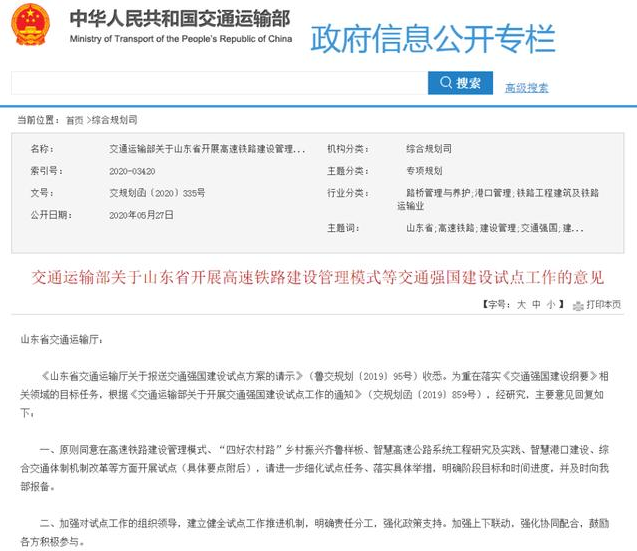 齊魯網(wǎng)·閃電新聞5月27日訊 日前,交通運輸部官網(wǎng)發(fā)布《交通運輸部關于開展高速鐵路建設管理模式等交通強國建設試點工作的意見》(以下簡稱意見)。意見明確,原則同意在高速鐵路建設管理模式、“四好農(nóng)村路”鄉(xiāng)村振興齊魯樣板、智慧高速公路系統(tǒng)工程研究及實踐、智慧港口建設、綜合交通體制機制改革等方面開展試點。
