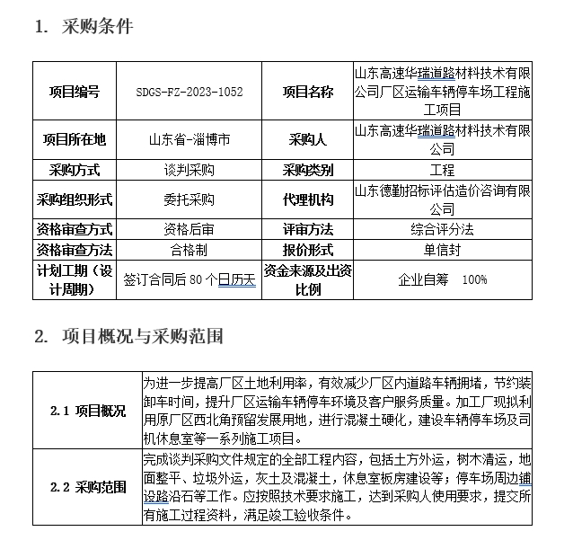 山東高速華瑞道路材料技術(shù)有限公司廠區(qū)運輸車輛停車場工程施工項目談判采購公告