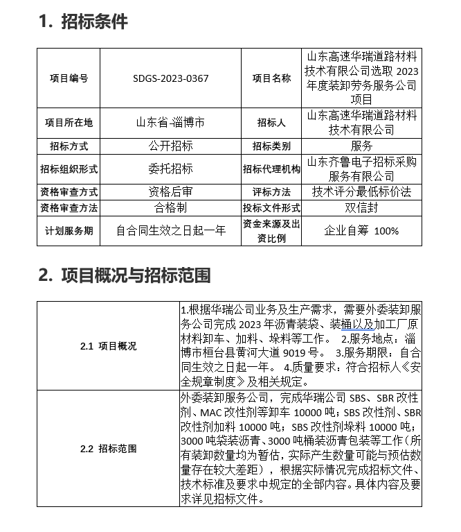 山東高速華瑞道路材料技術(shù)有限公司選取2023年度裝卸勞務(wù)服務(wù)公司項目招標公告