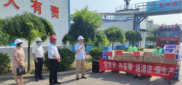 炎炎夏日送清涼,濃濃關(guān)懷沁人心,為推動(dòng)黨史學(xué)習(xí)教育走深、走實(shí),2021年8月4日,山東高速建材集團(tuán)黨委副書記、工會(huì)主席李鋒一行3人赴華瑞公司桓臺(tái)加工廠開展“學(xué)黨史、辦實(shí)事、送清涼、保生產(chǎn)”慰問(wèn)活動(dòng)。