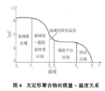 無定形聚合物的模量隨溫度變化表現(xiàn)出4種不同的狀態(tài),分別對應(yīng)聚合物的玻璃態(tài)、玻璃態(tài)-橡膠態(tài)轉(zhuǎn)變、橡膠態(tài)和黏流態(tài)。見圖4。玻璃化轉(zhuǎn)變溫度是聚合物由玻璃態(tài)至橡膠態(tài)轉(zhuǎn)變對應(yīng)的溫度,此時材料由脆性轉(zhuǎn)變?yōu)閺椥誀顟B(tài)。聚合物改性瀝青從廣義上屬千聚合物范疇,其低溫開裂的實質(zhì)是瀝青在實際使用溫度時處于玻璃態(tài),從而發(fā)生脆性斷裂,該現(xiàn)象與其粘彈性行為相對應(yīng)[18]。因此,可用玻璃化轉(zhuǎn)變溫度評價瀝青的低溫性能。材料的玻璃化轉(zhuǎn)變溫度越低越好,當(dāng)其遠低千改性瀝青的最低服務(wù)溫度時,瀝青材料處于高彈性,通過變形可有效釋放溫度變化引起的內(nèi)部應(yīng)力,減少低溫開裂的產(chǎn)生。
