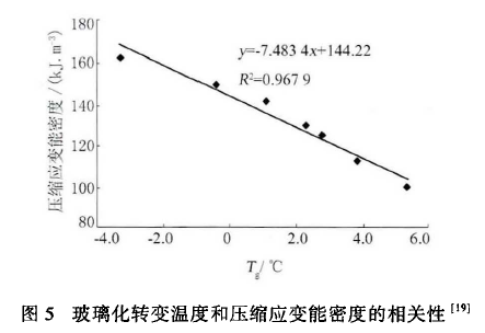 材料的玻璃化轉(zhuǎn)變溫度可由升降溫過程中物理性質(zhì)(如體積、熱力學(xué)性質(zhì)、電磁性質(zhì)以及力學(xué)性質(zhì))突變所對應(yīng)的溫度確定。其中,示差掃描量熱法(DSC)由于樣品用量少,測試精度高,被廣泛用于材料玻璃化轉(zhuǎn)變溫度的確定。Zhang等(20]通過大量DSC試驗證實改性瀝青的玻璃化轉(zhuǎn)變溫度與其低溫性能存在直接對應(yīng)關(guān)系,說明采用玻璃化轉(zhuǎn)變溫度表征聚合物改性瀝青的低溫性能具有理論和實際可行性。不同的聚合物改性瀝青對應(yīng)不同的玻璃化轉(zhuǎn)變溫度,這是因為聚合物存在不同的結(jié)晶形態(tài)和吸放熱,同時聚合物與瀝青的相容性以及兩者相互作用不同[19,21]。動態(tài)力學(xué)分析法(DMA)通過測定瀝青材料的動態(tài)力學(xué)譜以確定玻璃化轉(zhuǎn)變溫度。牛巖等[22]利用DMA在彎拉受力模式下得到了基質(zhì)瀝青、SBS改性瀝青以及橡膠瀝青及其混合料的玻璃化轉(zhuǎn)變溫度。研究發(fā)現(xiàn),不同改性瀝青及其混合料的玻璃化轉(zhuǎn)變溫度區(qū)分明顯,與混合料的低溫性能相關(guān)性好;相比改性瀝青的玻璃化轉(zhuǎn)變溫度,采用混合料的玻璃化轉(zhuǎn)變溫度評價其低溫性能更加合理。然而,與延度和弗拉斯脆點法相比,采用玻璃化轉(zhuǎn)變溫度評價改性瀝青低溫性能的研究較少,涉及的改性瀝青種類有限,因此仍需進一步開展相關(guān)研究。5種改性瀝青的延度和玻璃化轉(zhuǎn)變溫度比較見表3。玻璃化轉(zhuǎn)變溫度和壓縮應(yīng)變能密度的相關(guān)性[19]見圖5。