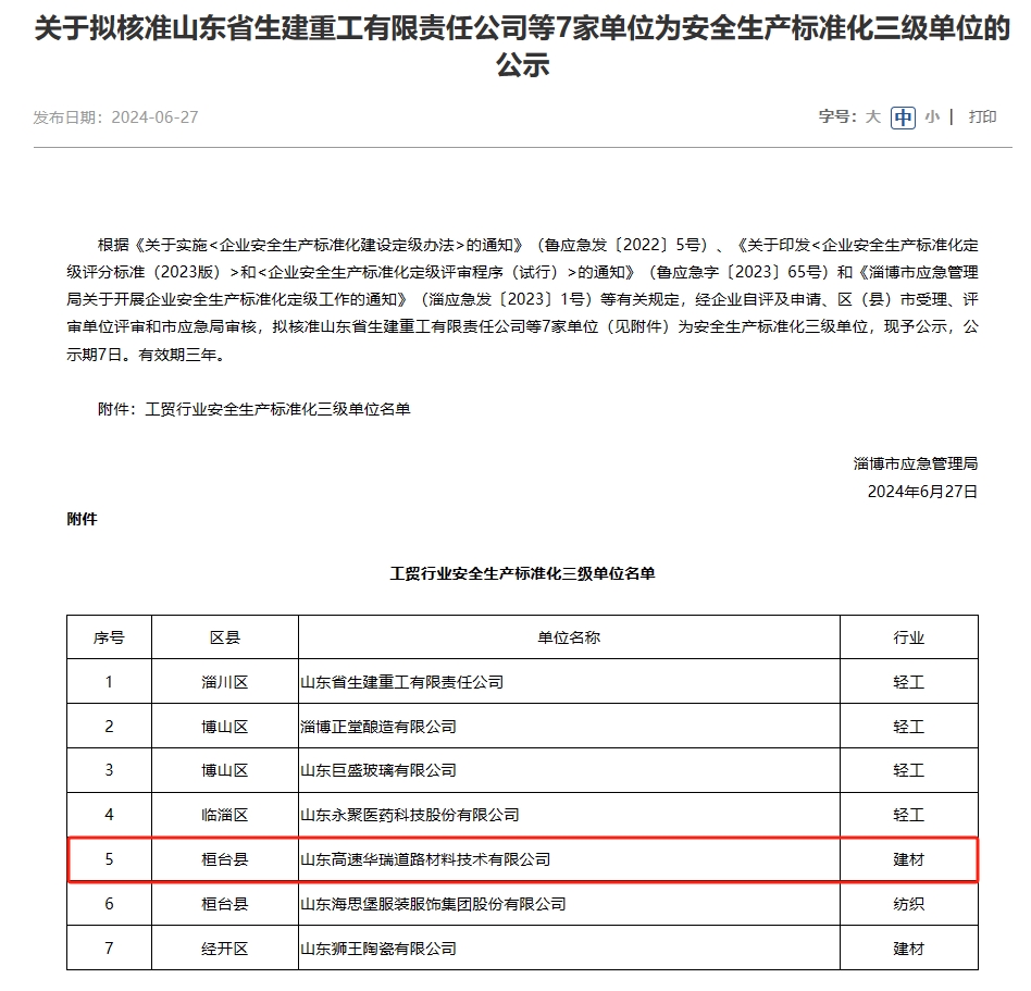 近日,淄博市應(yīng)急管理局發(fā)布公告,華瑞公司順利獲評(píng)淄博市工貿(mào)行業(yè)安全生產(chǎn)標(biāo)準(zhǔn)化三級(jí)單位。